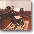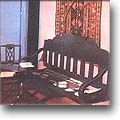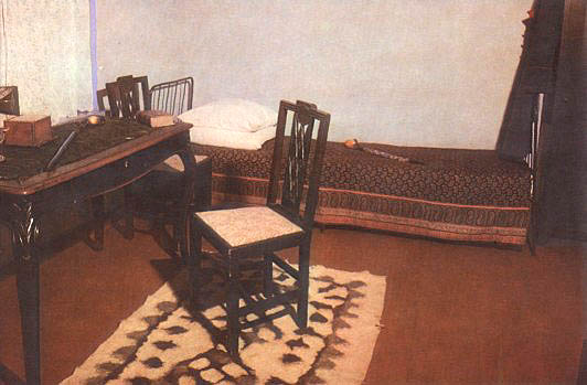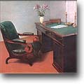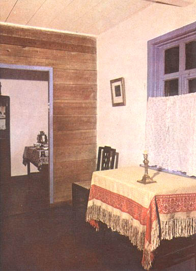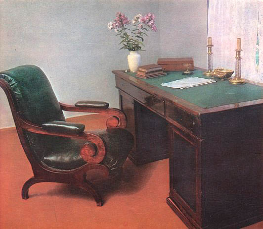 "С этим столом, как рассказывал отец, - писала она, - было у него связано много воспоминаний о поэте. За ним он читал отцу свои произведения. Накануне последнего отъезда Лермонтова из Петербурга они вместе разбирали бумаги, старые рукописи поэта, хранившиеся в ящиках его стола, отбирая нужные стихотворения для нового сборника, ненужные рукописи сжигали в камине". За этим столом были написаны в Петербурге "Герой нашего времени", "Демон", "Мцыри", "Бородино", "Смерть поэта", "Дума" и многие другие его поэтические создания. В другой комнате, служившей столовой и гостиной, у небольшого деревянного диванчика, покрытого войлочным ковриком, стоит круглый столик. Это подлинная вещь, сохранившаяся из прежней обстановки домика. По утрам Лермонтов работал за ним, вынося его на терраску, пристроенную со стороны сада.