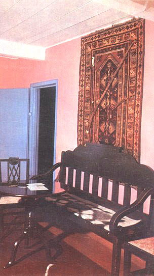 Из четырех комнат две занимал А. А. Столыпин (Монго), а две, обращенные окнами в сад, назывались "лермонтовской половиной". В них жил поэт. Через небольшие сени и полутемную прихожую посетители заходят в домик. Вид и обстановка его просты. Низкие деревянные потолки, положенные на балки и побеленные мелом; разноразмерные окна; простые стулья, обитые ситцем, походный складной самоварчик, металлический молочничек, полотенце с гербом Лермонтовых, колясочный сундук и узкая складная кровать. Многое напоминает о том, что жил здесь поэт-изгнанник, вынужденный странствовать с подорожной "по казенной надобности". В кабинете-спальне Лермонтова в настоящее время установлены стол и кресло из петербургской квартиры поэта. Они были переданы музею при его открытии в 1912 году дочерью троюродного брата Лермонтова А. П. Шан-Гирея.