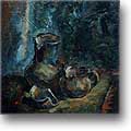 Глиняные горшки с примулами воссоздают картину ранней весны в сельской глубинке. Вставленная на дощатом столе рыба с картофелинами рассказывают о суровом быте рыбаков, а конская сбруя, развешенная у стоянки чабанов, - красноречиво свидетельствует о жизни горцев. Кош, горная долина, заснеженный перевал, сулящий опасности. И вот короткая передышка перед трудной работой...