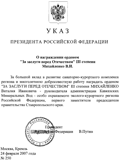 О награждении орденом "За заслуги перед Отечеством" Михайленко Виталия Ивановича