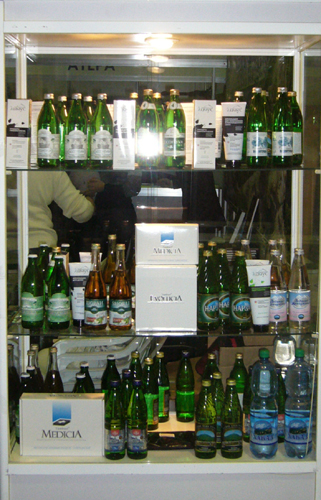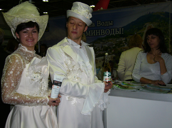Стенд Кавминвод был лекго узнаваемый по светящейся витрине, на которой были представлены практически все минеральные воды, выпускаемые в регионе и все виды расфасованной и упакованной целебной грязи, а так же банером с историческими местами Кавказских Минеральных Вод. А помогали рекламировать нашу минеральную воду и грязь "ряженные".