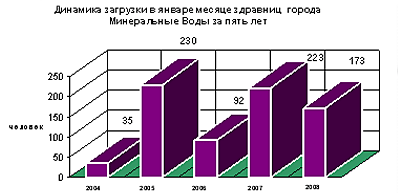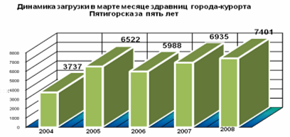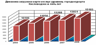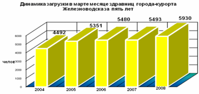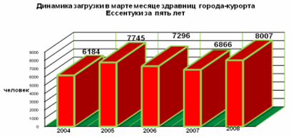 В марте 2008 года по городам-курортам Ессентуки, Железноводску, Кисловодску и Пятигорску сложилась положительная загрузка по сравнению с мартом 2007 года. Не большое снижение загрузки по санаторию в Минеральных Водах не сказалось на общих положительных результатах, что позволило получить прирост в 3298 человек.