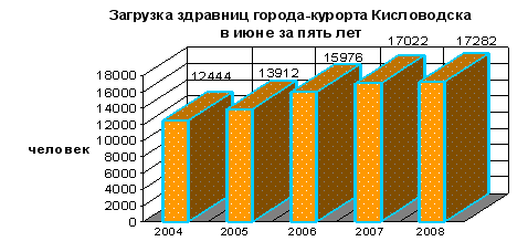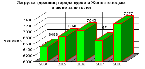 В июне 2008 года положительная загрузка против июня 2007 года сложилась по городам-курортам: Ессентуки, Железноводску и Кисловодску. Снижение произошло по городу-курорту Пятигорску и санаторию «Минеральные Воды» на 388 человек. Это снижение не сказалось на общих положительных результатах. Что позволило в июне месяце получить прирост в 1023 человека. За июнь 2008 года санаторно-курортный комплекс принял на лечение и оздоровление детей 12162 человека, а за шесть месяцев 2008 года – 37272 человека, на 6458 человек больше, чем за шесть месяцев 2007 года. Количество детей, принятых на лечение и оздоровление на Кавказских Минеральных Водах составило за первое полугодие 2008 года 16,8 процента всех отдыхающих на федеральном курорте. На курортах Кавказских Минеральных Вод в июне месяце 2008 года отдыхали и лечились 965 иностранных граждан, а с начала года – 3607 человек или 1,6 процента всех отдыхающих на федеральном бальнеологическом курорте Российской Федерации. Загрузка санаторно-курортной базы Кавказских Минеральных Вод в июне 2008 года составила 120,0 процентов, в том числе (в процентах):