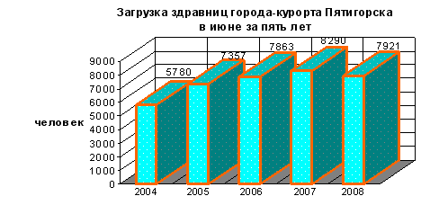 Здравницы города-курорта Кисловодска в июне 2008 года приняли на 1306 человек больше, чем в июне 2006 года и на 4838 человек больше, чем в июне 2004 года. 7. Город-курорт Пятигорск В городе-курорте Пятигорске 23 здравницы на 6700 мест. В июне месяце в эксплуатации находилось 5273 места или 78,7 процента всей коечной емкости курорта. Загрузка здравниц в июне месяце составила 107,8 процента. Было предоставлено 152119 койко-дней, принято на отдых и лечение 7921 человек, на 369 человек меньше, чем в июне 2007 года. От основной деятельности получено более 127 млн. рублей доходов. Принято в июне месяце детей – 3609 человек, а с начала года – 8853 человека. В июне месяце на Пятигорском курорте отдыхали 79 иностранных граждан, а с начала года – 260 человек. От работы санаторно-курортных учреждений Пятигорска по итогам работы за шесть месяцев 2008 года поступило в бюджеты всех уровней 58 млн. 848 тыс. рублей налоговых платежей, в том числе 16 млн. 207 тыс. рублей в местный бюджет. Из 18 ведомственных здравниц Пятигорска в июне месяце работали 14 санаториев и пансионатов, которые предоставили 78840 койко-дней, приняли на отдых и лечение 4287 человек. Коэффициент загрузки составил 108,2 процента. В июне месяце ведомственными здравницами получено более 48 млн. рублей доходов. Принято на отдых и оздоровление детей – 1023 человека, а с начала года – 4118 человек. Цена путевки в июне месяце по ведомственным здравницам составляла: