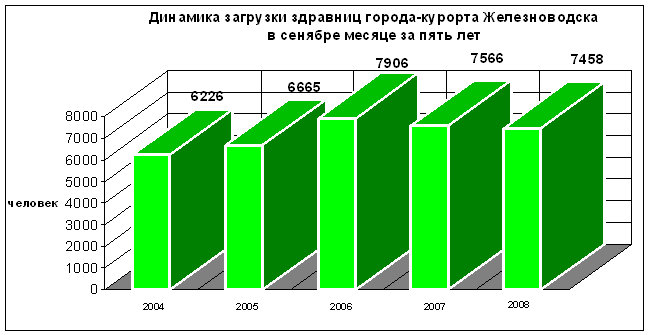 Здравницы города-курорта Железноводска в сентябре 2008 года приняли на 448 человек меньше, чем в сентябре 2006 года, но на 1232 человека больше, чем в сентябре 2004 года.