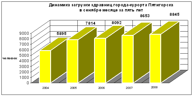 Здравницы города-курорта Пятигорска в сентябре 2008 года приняли на 753 человека больше, чем в сентябре 2006 года, и на 2950 человек больше, чем в сентябре 2004 года.