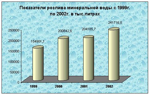 Реализация минеральной воды производилась в стеклянной таре и ПЭТ - бутылках емкостью от 0,33 до 2,0 литров. За декабрь месяц розлив минеральной воды в условной бутылке 0,5 литра составил 32 млн. 494 тыс. бутылок или 1 млн. 50 туб (тысяч условных бутылок) емкостью 0,5 литра ежедневно сходили с конвейеров заводов и цехов по розливу минеральной воды. За 2002 год эти показатели несколько выше, и составили 483 млн. 434 тысяч условных бутылок минеральной воды, то есть ежедневно с конвейеров заводов и цехов региона сходило 1 млн. 324 тыс.бутылок минеральной воды. Показатели розлива минеральной воды в декабре месяце 2002 года по сравнению с соответствующим периодом 2001 года (тыс. л)