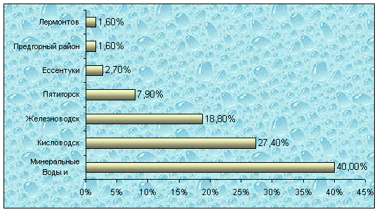 Ессентуки. В городе 10 предприятий по розливу минеральных вод - "Ессентуки-4", "Ессентуки-17", "Ессентуки-20", "Ессентуки 2 - Новая", "Нагутской", "Ессентуки - родниковая" и "Святой ключ". Не работали с начала года АООТ "Ессентукский завод минеральных вод". и ЗАО "Кавминводырозлив". Шесть предприятий Ессентуков произвели в декабре 2002 года розлив 473 тыс. литров или на 193 тыс. 400 литров больше, чем в декабре месяце 2001 года. За 12 месяцев 2002г. розлив составил 6 млн. 404 тыс. 400 литров или на 4 млн. 16 тыс. литров меньше, чем за соответствующий период прошлого года. Удельный вес промышленного розлива минеральных вод в декабре составил 2,9 процента к общему объему розлива минеральных вод в регионе, а с начала года 2,7 процента. Единственный город, где с нарастающим итогом второй год идет снижение промышленного розлива минеральных вод. Ессентукские предприятия по розливу минеральных вод за 12 мес.2002г. уплатили налогов в бюджеты всех уровней - 17 млн. 322 тыс. рублей, в том числе: 3 млн.548 тыс.рублей в краевой и 4 млн.562 тыс.рублей в местный бюджет. Минеральные Воды. В городе и районе пять предприятий по розливу минеральной воды. В декабре месяце 2002 года работали три предприятия, которые обеспечили розлив 7 млн. 763 тыс. 200 литров минеральных вод "Новотерская целебная", "Славяновская", "Железноводская", "Ессентуки-2 новая", "Ессентуки № 4", "Ессентуки № 17" и "Нагутская". Розлив минеральных вод в декабре 2002 года на 1 млн. 236 тыс. 500 литров больше, чем в декабре 2001 года, а за 12 месяцев текущего года на 19 млн. 50 тыс. 500 литров больше, чем за соответствующий период прошлого года. Удельный вес розлива минеральных вод в декабре месяце составил 47,8 процента, а за 12 месяцев - 40,2 процента к общему объему розлива минеральных вод на КМВ. Минераловодские предприятия по розливу минеральной воды за 12 месяцев 2002 г. уплатили налогов в бюджеты всех уровней 56 млн.939 тыс. рублей, в том числе: 7 млн.386 тыс.руб. в краевой и 2 млн.432 тыс.рублей в местный бюджет. Кисловодск. В городе 4 предприятия по розливу минеральной воды "Нарзан", "Святой Георгий" и "Кисловодский источник". В декабре месяце работал холдинг "Нарзан", ООО "Заря Цахилов" и ООО "Завод "Кисловодскминрозлив", обеспечившие розлив 4 млн. 291 тыс. 400 литров минеральной воды, на 2 млн. 563 тыс. 400 литров больше, чем в декабре 2001 года. За 12 месяцев 2002 года розлив минеральной воды составил 66 млн. 206 тыс.200 литров или на 15 млн. 752 тыс. 900 литров больше, чем за соответствующий период прошлого года. Удельный вес розлива минеральных вод в декабре месяце составил 26,4 процента, а за 12 месяцев - 27,4 процента к общему объему розлива минеральных вод в регионе. От работы заводов по промышленному розливу минеральных вод за 12 месяцев 2002 года поступило налогов в бюджеты всех уровней 27 млн. 994 тыс. рублей, в том числе: 2 млн.775 тыс.руб. в краевой и 10 млн. 842 тыс.рублей в местный бюджет. Железноводск. В городе шесть предприятий занимающиеся промышленным розливом минеральных вод "Славяновская", "Смирновская", "Железноводская", "Нагутская № 26", "Лысогорская", "Консульская" и "Ессентуки-17". В декабре 2002 года работали все шесть заводов, которые обеспечили розлив 2 млн. 295 тыс. 900 литров или на 11 тыс. 600 литров большое, чем в декабре 2001 года. За 12 месяцев 2002 года розлив железноводских предприятий составил 45 млн. 437 тыс. 400 литров или на 1 млн. 309 тыс. 300 литров больше, чем за соответствующий период прошлого года. Удельный вес розлив