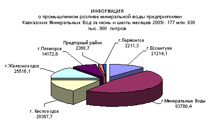Рост промышленного розлива минеральной воды за шесть месяцев 2005 года по отношению к шести месяцам 2004 года составил 22 млн. 89 тыс. литров. Сказалась успешная работа предприятий города Минеральные Воды и Минераловодского района, городов Ессентуки и Кисловодска, а также Предгорного района.