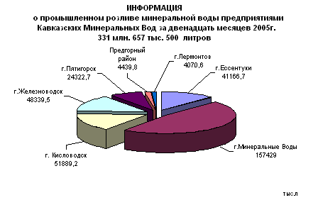 За двенадцать месяцев 2005 года розлив составил 4 млн. 70 тыс. 600 литров или на 610 тыс. 800 литров больше, чем за соответствующий период прошлого года. Удельный вес розлива минеральных вод в Лермонтове за де-кабрь месяц составил 0,9 процента, а за двенадцать месяцев – 1,2 процента от общего объема розлива минеральных вод в регионе. От работы завода минеральных вод г. Лермонтова в бюджеты всех уровней поступило налоговых платежей 1 млн. 622 тыс.рублей, в том числе 331 тыс.рублей в местный бюджет. Таблица 1. Реализация минеральной воды предприятиями Кавказских Минеральных Вод декабрь и двенадцать месяцев 2005 года