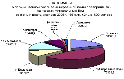 Очень убедительно выглядят показатели июня месяца 2006 года, полученные за счёт роста объёмов выпуска продукции предприятиями ООО «Целебный источник» и ООО «АКВА-ВАЙТ». Только эти два предприятия за июнь месяц произвели 4 млн. 692 тыс. 900 литров или 92,5 процента всей продукции произведённой в город Ессентуки. От работы заводов минеральных вод города в бюджеты всех уровней поступило налоговых платежей 7 млн. 633 тыс.рублей, в том числе 1 млн. 302 тыс.рублей в местный бюджет. Удельный вес розлива минеральных вод в июне месяце составил 14,8 процента, а с начала года – 19,0 процентов к общему объему промышленного розлива минеральных вод в регионе. Минеральные Воды. Пять предприятий Минеральных Вод и Минераловодского района обеспечили в июне месяце 2006 года розлив 14 млн. 465 тыс. 800 литров минеральной воды «Новотерской целебной», «Ессентуки № 2, 4, 17, 20», «Славяновской», Ессентуки целебная, Рокадовская, Рокадовская курортная, Рокадовская Соборная, Рокадовская – стандарт чистоты, «Аква-Дон», «Железноводской» и «Нагутской-26», на 9 млн. 18 тыс. 700 литров меньше, чем в июне 2005 года. За шесть месяцев 2006 года заводы минеральных вод обеспечили розлив 72 млн. 308 тыс. 900 литров или на 11 млн. 471 тыс. 500 литров меньше, чем за шесть месяцев 2005 года. Сказалось заметное снижение розлива минеральных вод крупнейшими предприятиями региона ЗАО «Кавминводы» ОАО «Рокадовские Минеральные Воды». Произведено с начала года и направлено в реализацию 7 млн. 973 тыс. 800 литров бутилированной питьевой воды. Направлено на экспорт 3 млн. 35 тыс. 800 литров минеральных вод в ассортименте. За шесть месяцев 2006 года в консолидированный бюджет от работы заводов минеральных вод поступило налоговых платежей 61 млн. 161 тыс. рублей, в том числе 3 млн. 301 тыс. рублей в местный бюджет.