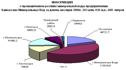 От работы предприятия по розливу минеральной воды в консолидированный бюджет за девять месяцев 2006 года направлено 863 тыс. рублей налоговых платежей, в том числе 57 тыс. рублей в местный бюджет. Таблица 1. Реализация минеральной воды предприятиями Кавказских Минеральных Вод за сентябрь и девять месяцев 2006 года (тыс.л)