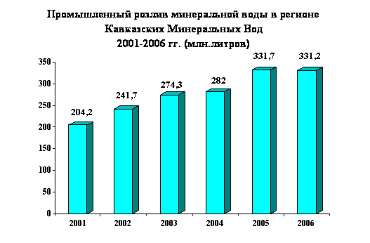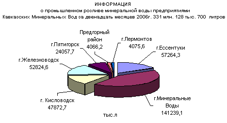 За двенадцать месяцев 2006 года розлив составил 4 млн. 75 тыс. 600 литров или на 5 тыс.литров больше, чем за соответствующий период прошлого года. Удельный вес розлива минеральных вод в Лермонтове за декабрь месяц составил 0,7 процента, а за двенадцать месяцев – 1,2 процента от общего объема розлива минеральных вод в регионе. От работы завода минеральных вод г.Лермонтова в бюджеты всех уровней поступило налоговых платежей 1 млн. 53 тыс.рублей, в том числе 183 тыс.рублей в местный бюджет. Таблица 1. Реализация минеральной воды предприятиями Кавказских Минеральных Вод декабрь и двенадцать месяцев 2006 года