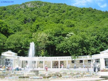 2. Источники ЖелезноводскаЖелезноводские источники расположены на небольшой площади вокруг горы Железной и по расположению на разных склонах горы объединяются в три основные группы: южную (точнее, юго-западную), восточную и северную. За последние 25 лет выведены источники также на северо-западном и западном склонах горы Железной, которые могут быть объединены в четвертую (западную) группу. По газовому и ионному составу воды всех основных железноводских источников однотипны: углекислые сульфатно-гидрокарбонатные кальциево-натриевые с минерализацией 3,0-3,7 г/л и содержанием углекислоты 0,7-1,4 г/л. По температуре указанные воды делятся на высокотермальные (42°С), термальные (35-42°С), слаботермальные (20-35°С) и холодные (ниже 20°С).