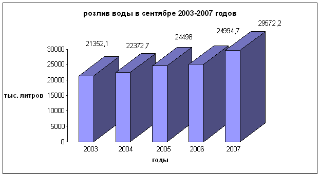 Реализация минеральной воды производилась в стеклянной таре и ПЭТ – бутылках емкостью от 0,33 до 2,0 литров. За сентябрь месяц розлив минеральной воды в условной бутылке 0,5 литра составил 59 млн. 144 тыс. бутылок или 1 млн. 972 туб (тысяч условных бутылок) емкостью 0,5 литра ежедневно сходили с конвейеров заводов и цехов по розливу минеральной воды. С начала года розлив составил 584 млн. 452 тысячи условных бутылок или ежедневно с конвейеров заводов сходило 2 млн. 133 тыс. бутылок емкостью 0,5 литра. Таблица 2. Показатели сентября месяца 2007 года по сравнению с соответствующим периодом 2003-2006 года (в тыс.л)