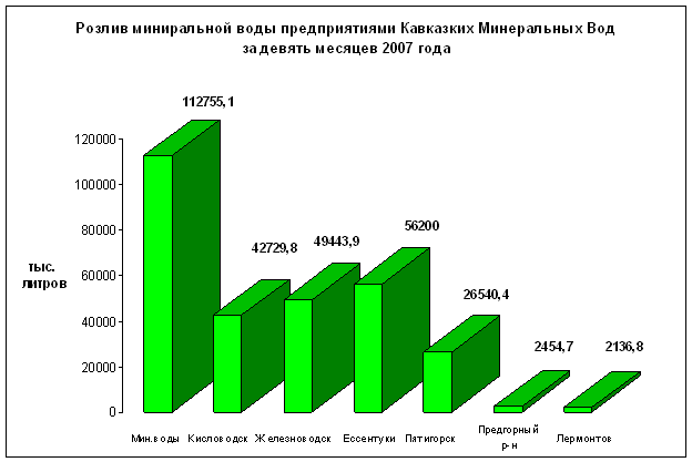 Значительный промышленный розлив минеральной воды за девять месяцев 2007 года по отношению к девяти месяцам 2006 года составил 28 млн. 424 тыс.100 литров. В большей степени сказался розлив питьевой негазированной воды. С другой стороны, большинство основных заводов работало ритмично, используя повышенный спрос рынка на минеральную и питьевую воду. За три месяца 2007 года прирост составлял 11 млн. 819 тыс. литров. За шесть месяцев произошёл максимальный прирост на 40 млн. 593 тыс. литров за счёт повышенного спроса на минеральные воды региона. По итогам девяти месяцев рынок уравнял показатели розлива и на конец года ожидается прирост на 30 млн. литров по отношению к итогу 2006 года. Подготовлено отделом курортов и туризма администрации КМВ |
