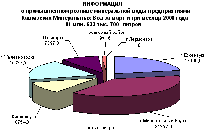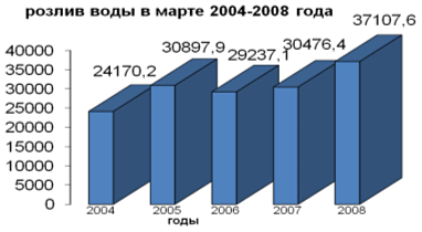 По итогам марта месяца 2008 года за последние пять лет заметен существенный рывок вперёд, который перекрывает все спады и подъёмы предыдущих лет. Заводы определяют политику поставки воды в регионы, оформляют договоры на год и постепенно выходят из межсезонного периода. Произошла активизация работы заводов в городах-курортах Ессентуки и Железноводске. Таблица 3. Показатели марта 2008 года по сравнению с соответствующим периодом 2007 года (в тыс.л)