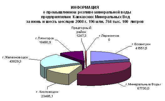 2006 и 2008 годах просматривается снижение промышленного розлива минеральных вод. Все остальные годы, начиная с 2003 года, шло стабильное наращивание розлива минеральных вод. При увеличении спроса на рынке минеральных вод предприятия региона вполне могут изменить ситуацию в положительную сторону. ИНФОРМАЦИЯ о промышленном розливе минеральной воды предприятиями Кавказских Минеральных Вод за июнь и шесть месяцев 2008 года