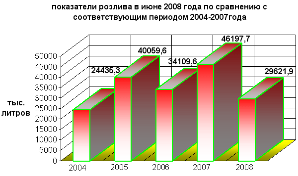 Реализация минеральной воды производилась в стеклянной таре и ПЭТ-бутылках емкостью от 0,33 до 2,0 литров. За июнь 2008 года розлив минеральной воды в условной бутылке 0,5 литра составил 59 млн. 244 тыс. бутылок или 1 млн. 975 туб (тысяч условных бутылок) емкостью 0,5 литра ежедневно сходили с конвейеров заводов и цехов по розливу минеральной воды. С начала года розлив составил 393 млн. 528 тысяч условных бутылок или ежедневно с конвейеров заводов сходило 2 млн. 162 тыс.бутылок емкостью 0,5 литра. Таблица 2. Показатели июня 2008 года по сравнению с соответствующим периодом 2004-2007 года (в тыс. л)