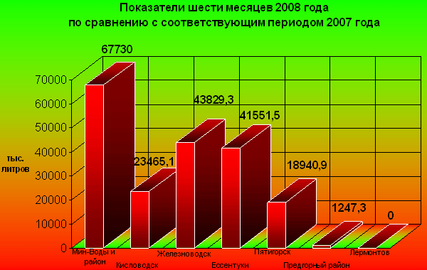 В июне 2008 года снижение промышленного розлива минеральных вод составило 16 млн. 575 тыс. 800 литров против соответствующего периода прошлого года. Снижение розлива минеральных вод сложилось по всем городам, кроме города Пятигорска. Таблица 4. Показатели шести месяцев 2008 года по сравнению с соответствующим периодом 2007 года (в тыс.л)