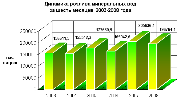 По итогам промышленного розлива минеральной воды за шесть месяцев 2008 года по отношению к шести месяцам 2007 года снижение розлива минеральных вод составило 8 млн. 872 тыс.литров. Динамика розлива минеральных вод за шесть месяцев 2003-2008 года (тысяч литров)